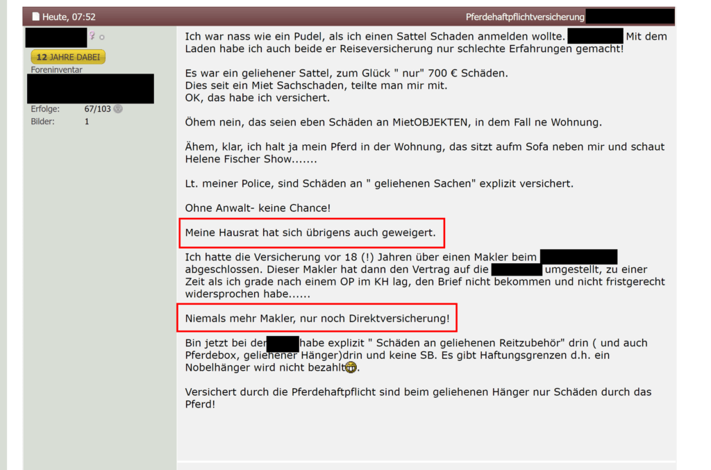 Kurze Zeit später tauchte in einem Reiter-Forum eine Frage auf. Da hatte sich – Achtung: „eine Freundin“ der Fragestellerin ein Pferd gekauft und dieses mit einem geliehenen Hänger abgeholt. Unterwegs hat sich das Pferd aufgeregt und den geliehenen Hänger komplett zerlegt. Dieser hatte einen Totalschaden, Kostenpunkt ca. 8.000 €.