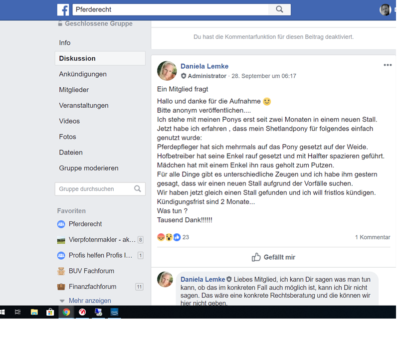 Ganz aktuell fragt ein Mitglied der Facebook-Gruppe „Pferderecht“ zum gleichen Thema an:
