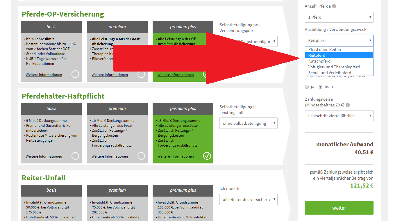Diese Tarife schließen Schäden aus, die sich beim oder durch das Reiten des Pferdes ereignen.